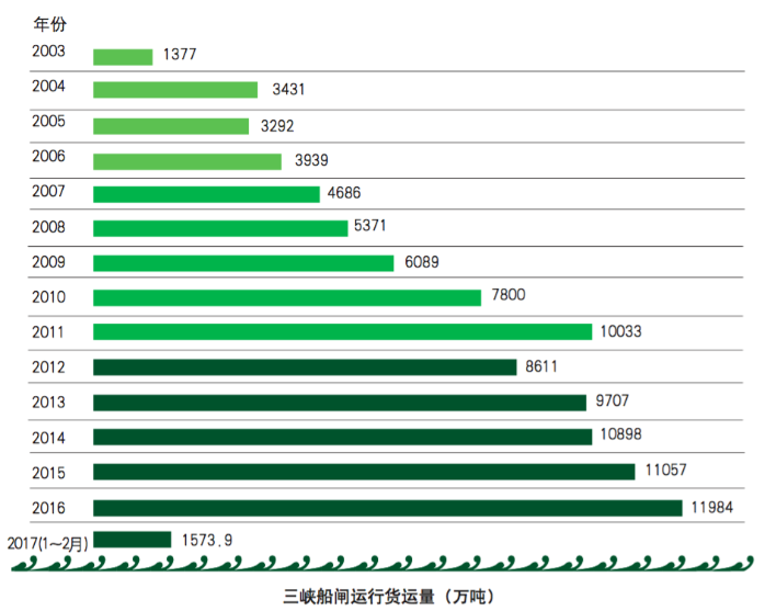 投入運行以來,三峽船閘過閘貨運量逐年遞增,2011年首次突破億噸,提前19年達到設計能力。2014年至2016年連續3年貨運量突破億噸。截至2017年3月7日,三峽船閘累計運行12.87萬閘次,過船73.1萬艘次,通過旅客1181.5萬人次,貨運量10.01億噸。