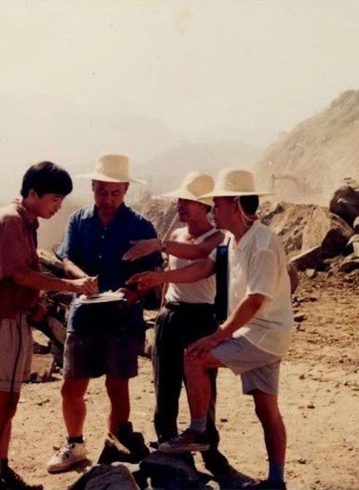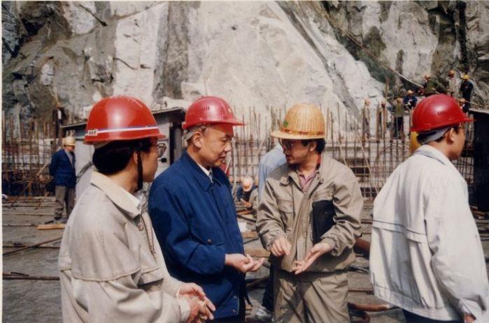 1994年,導流明渠右邊坡設計,鄭守仁(左二)與地質人員在現場研究危巖體處理