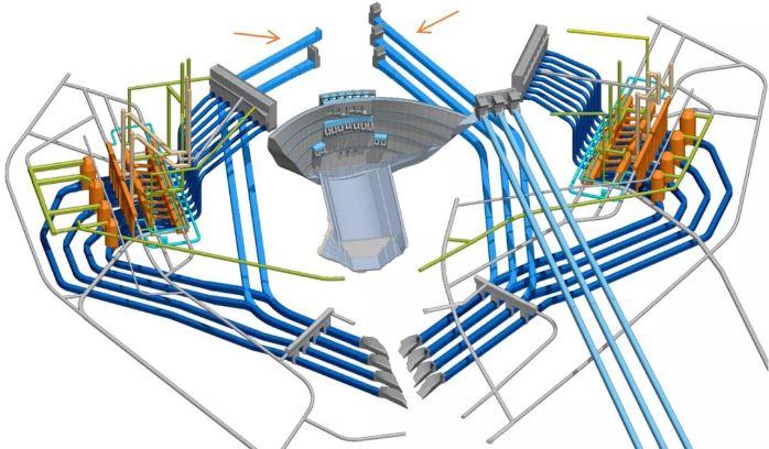 ▲ 在復雜的地下洞室群中,天藍色管路為導流洞(白鶴灘工程建設部供圖)